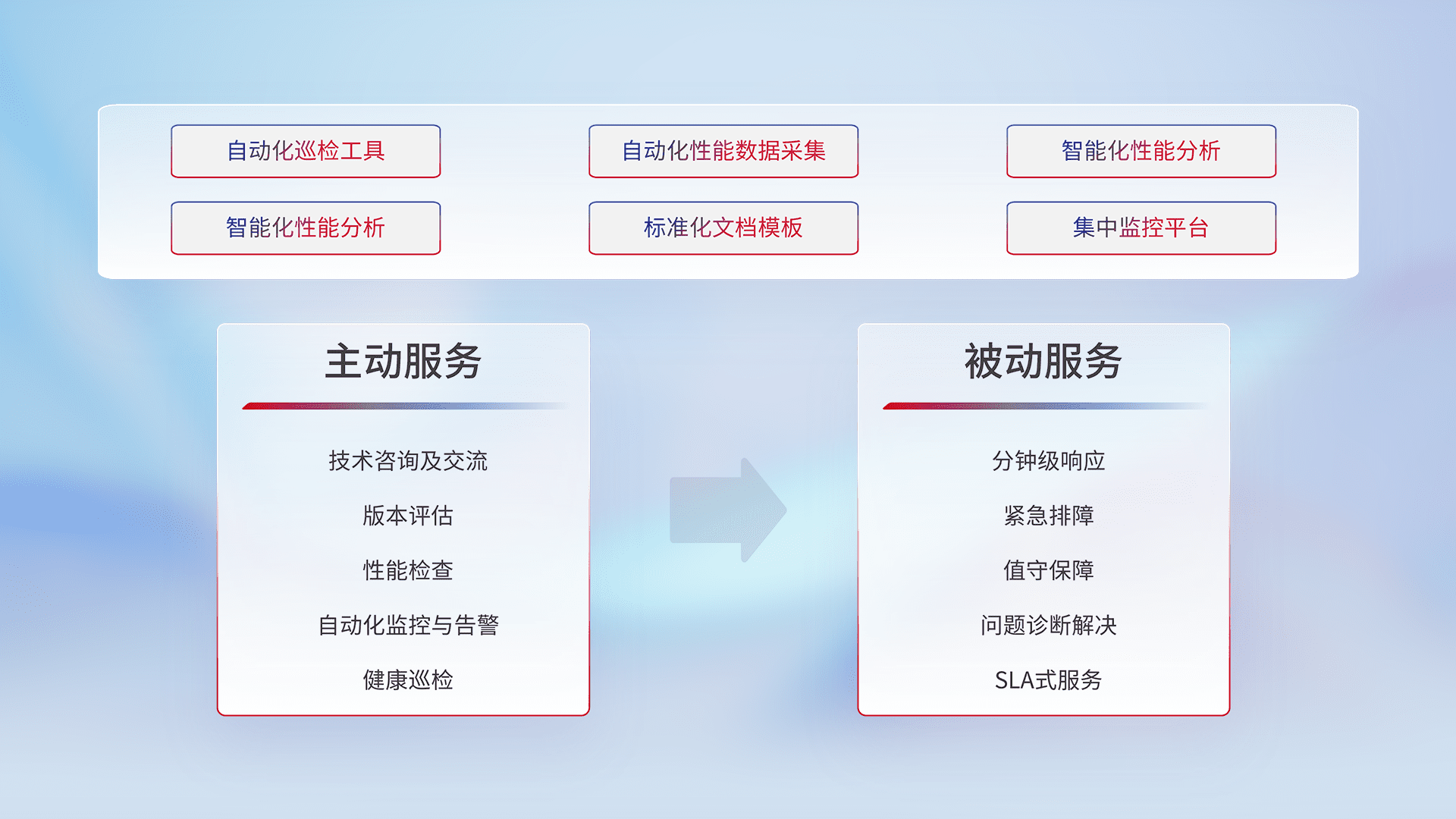 智能化工具和标准化文档,,保障服务质量,,提供主动服务(包含技术咨询、、、版本评估、、、性能检查、、、、自动化监控与告警、、健康巡检)和被动服务包含(分钟级响应、、、紧急排障、、、、值守保障、、、、问题诊断解决、、、、SLA服务)。。。