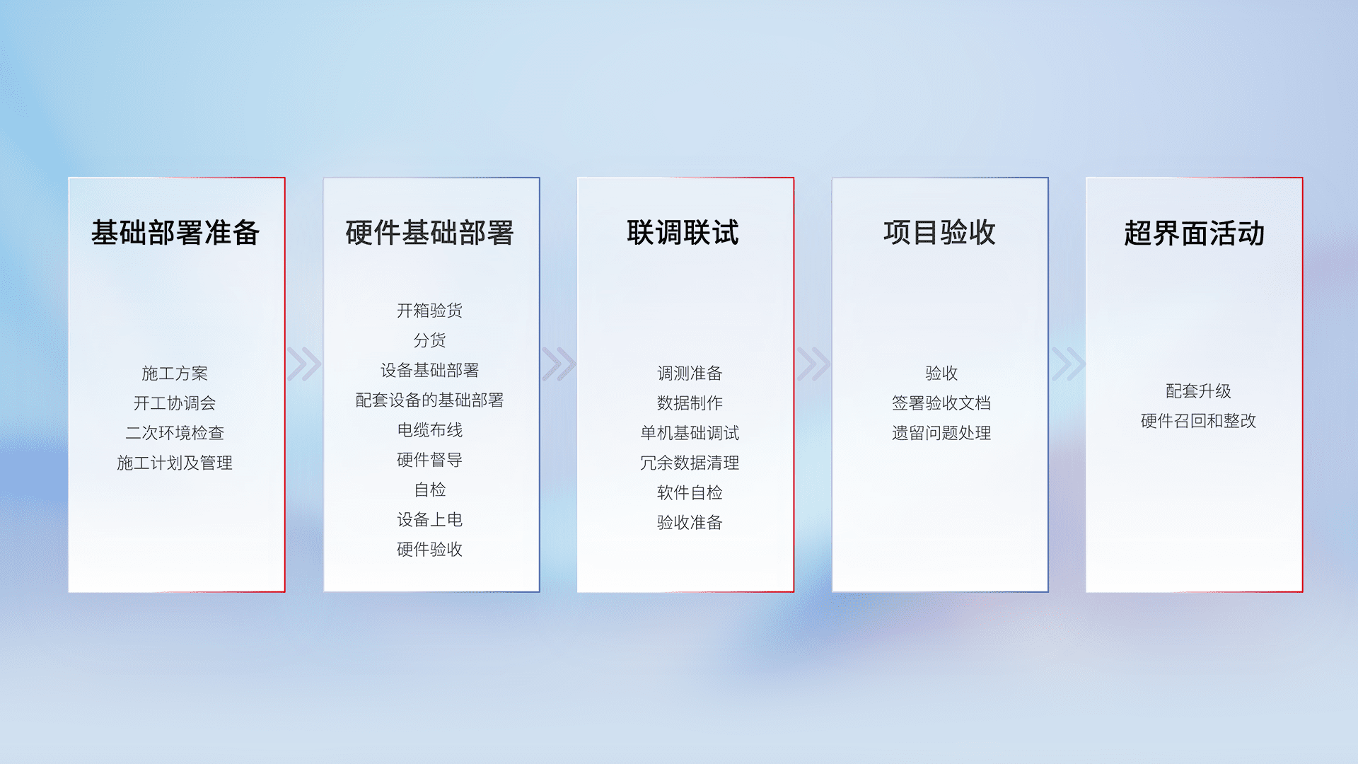 从基础部署准备、、、硬件基础部署、、、、联调联试、、、、项目验收、、、越界面活动的全过程可追溯,,,,保证施工质量和进度。。。